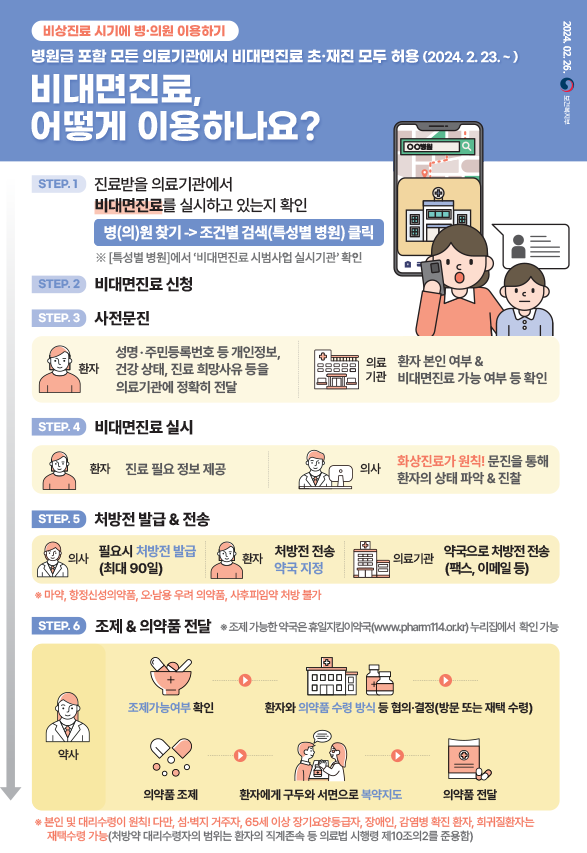 병원에서 진료받고 약을 처방받는데 3~4시간씩 걸려야 하는데요. 계속 먹어야 하는 약을 처방받거나 간단한 진료로 처방받을 수 있는 질병이라면 비대면 진료를 통하여 짧은 시간에 원하는 처방을 받을 수 있게 되었습니다. 아직은 익숙지 않은 방법이지만 효율적이라고 생각됩니다. 처음에만 어설프고 낯설지만 한번 해보면 정말 편한 제도입니다